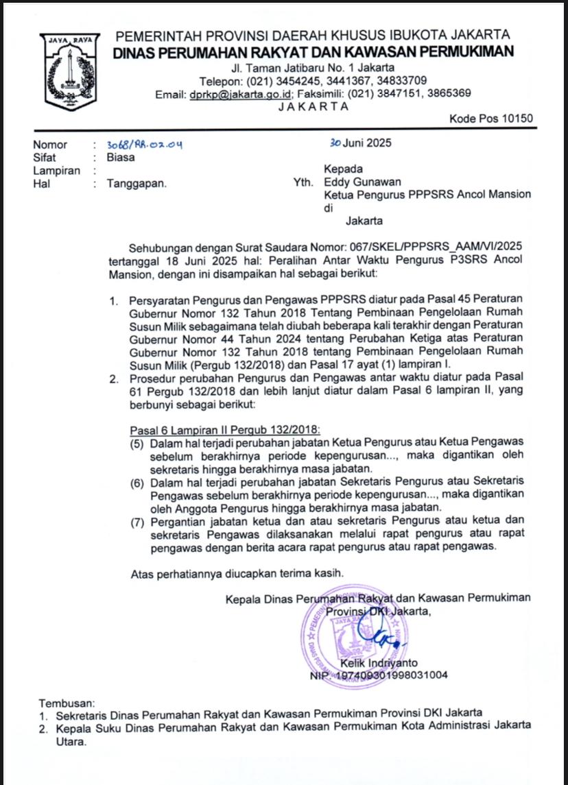 Tanggapan Permohonan Pengesahan Perubahan AD.ART PPPSRS Apartemen Ancol Mansion